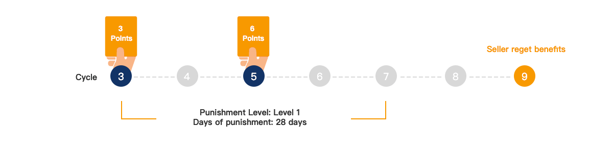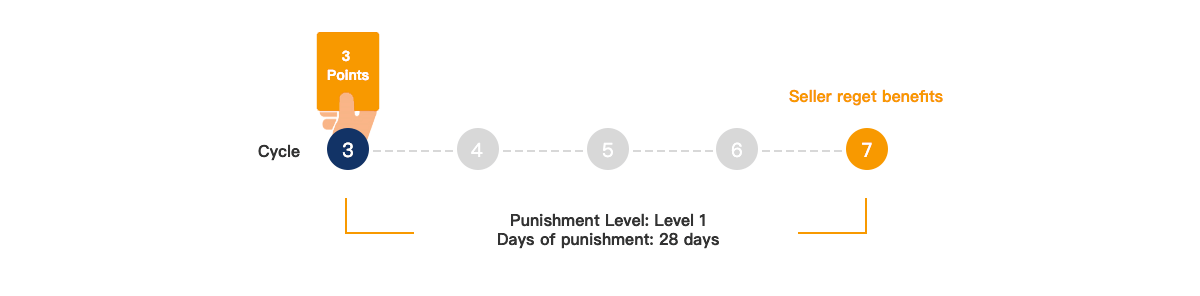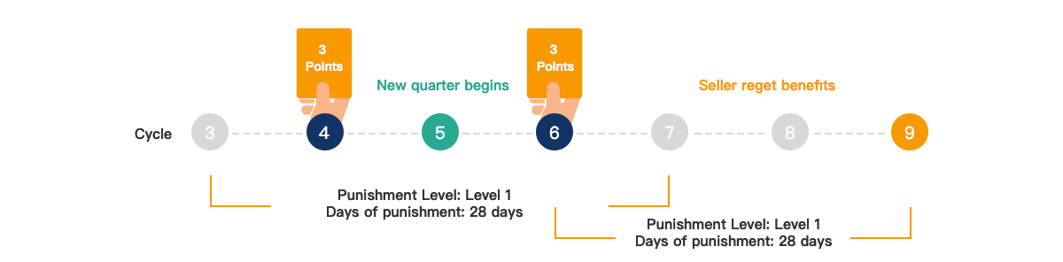 Example 2: Seller B gains 3 points in the 3rd and 3 points in the 5th week. These points will be accumulated to define the level, and the rights will be regained in the 9th week